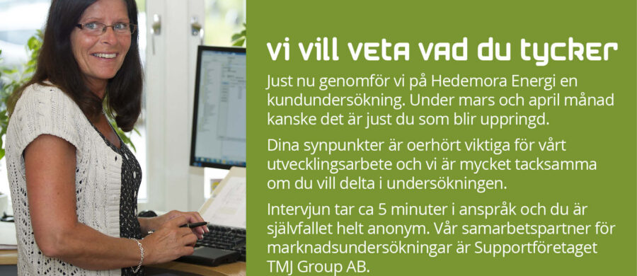 Vi vill veta vad du tycker Just nu genomför vi på Hedemora Energi en kundundersökning. Under mars och april månad kanske det är just du som blir uppringd för en intervju med frågor angående Hedemora Energi. Dina synpunkter är oerhört viktiga för vårt utvecklingsarbete och vi är mycket tacksamma om du vill delta i undersökningen. […]