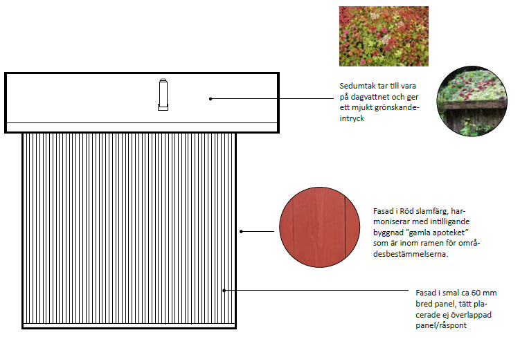 Pumphuset har utformats i samråd med kommunens stadsarkitekt för att passa in så bra som möjligt i den omgivande kulturmiljön. Fasaden kommer att vara av faluröd träpanel och taket ett grönt tak (växtbeklätt tak).