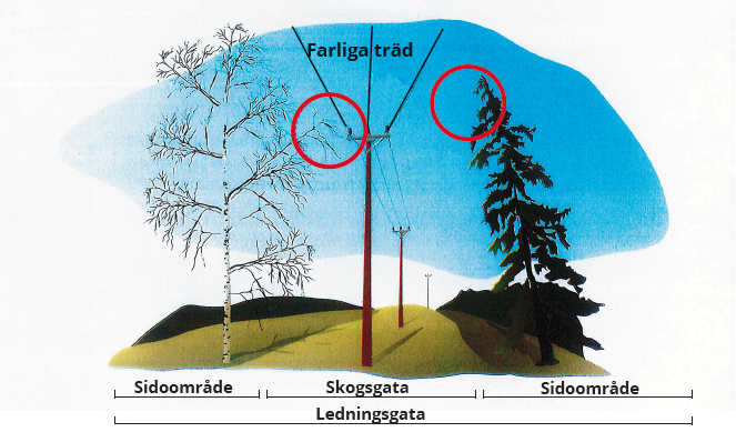 Alla träd och sly i ledningsgatan röjs bort, en-buskar sparas om möjligt. För att säkra elleveransen kan så kallade ”farliga träd” inom ledningsgatan komma att fällas om det bedöms nödvändigt.