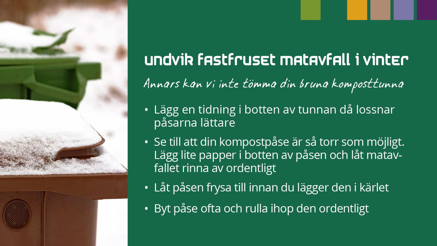 Med vintern och kylan återkommer problemet med fastfruset matavfall i komposttunnorna. Det innebär att vi inte kan tömma din bruna komposttunna.