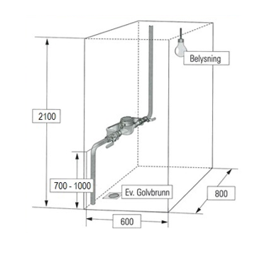 Utrymmet ska vara belyst. Vid mätplatsen bör golv och närbeläget väggparti vara utfört så att det tål spill och läckage av vatten. Utrymmet ska ha golvbrunn om servisen har DN 50 eller större. Det måste även finnas ett fritt utrymme vid mätaren så att personal från Hedemora Energi lätt kommer åt mätaren vid avläsning, byte eller service. Se måttanvisningar intill. Mätaren får heller inte byggas in eller placeras bakom tung utrustning.